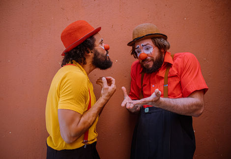 Dois palhaços cheios de vontade de fazer graça — só não sabiam que marcaram o mesmo lugar e o mesmo horário pra apresentar o seu show! A confusão tá feita: um quer o palco, o outro também!